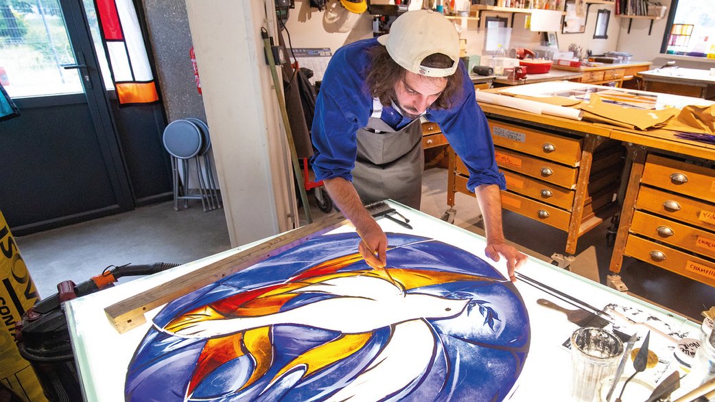 Ici, on travaille la porte ouverte -sauf l’hiver ! Les gens qui passent devant l’atelier pour aller au parc de la Volière s’arrêtent, nous posent des questions sur notre métier… » Léo Uzabiaga ne cache pas son plaisir de faire découvrir sa pratique de vitrailliste. Le jeune chef d’entreprise (34 ans) a fondé l’Atelier UZB en 2022, à Reims, en compagnie de son père, Eric, lui-même vitrailliste. Tous deux ont oeuvré de nombreuses années au sein de l’Atelier Simon-Marq. En 2024, son projet d’installation à Villers-Allerand a été soutenu par Bernard Weiler, le maire, qui a vu l’occasion d’apporter de l’activité au coeur de la commune.